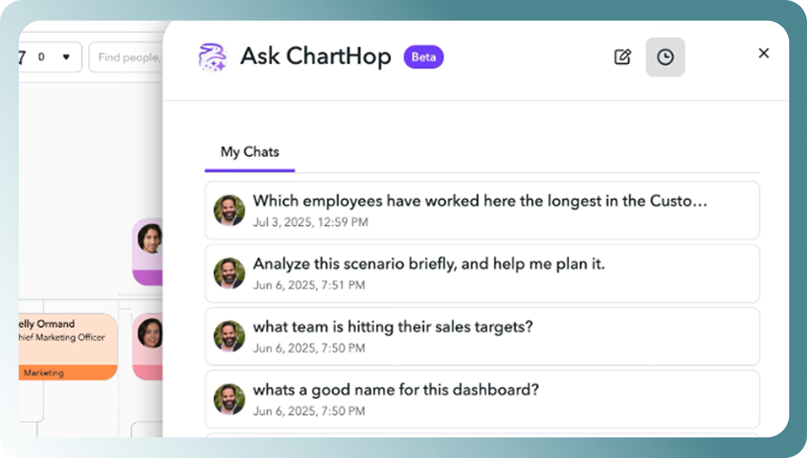 AI-powered insights are even more useful when you can pick up right where you left off. With Ask ChartHop Chat History, you can now access previous AI threads, whether they were started from Ask ChartHop directly or through Insight and Analysis buttons.